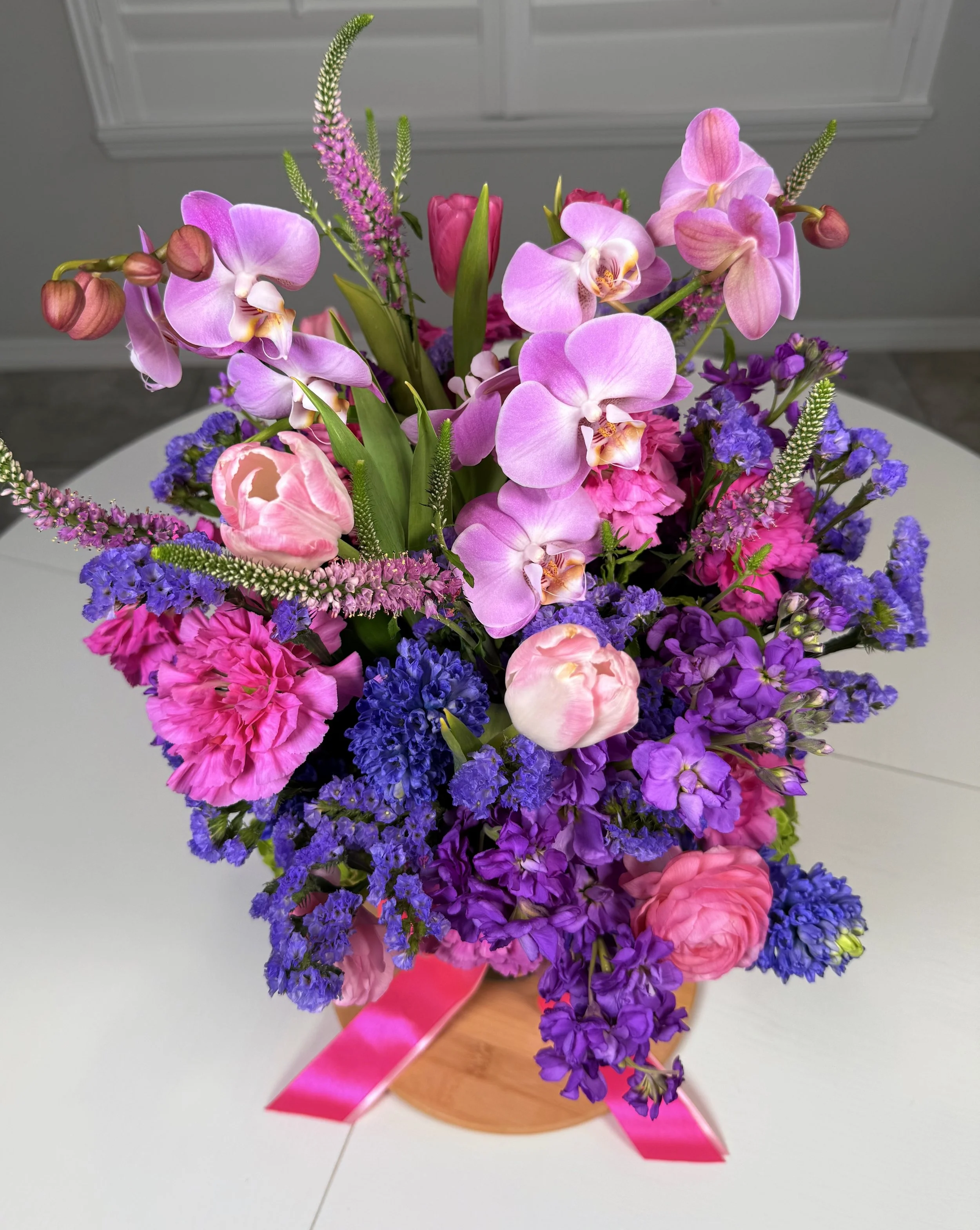This arrangement was designed around saturation and movement. Layered pink orchids anchor the piece, creating height and boldness, while vibrant purples and fuchsias build depth throughout the base.