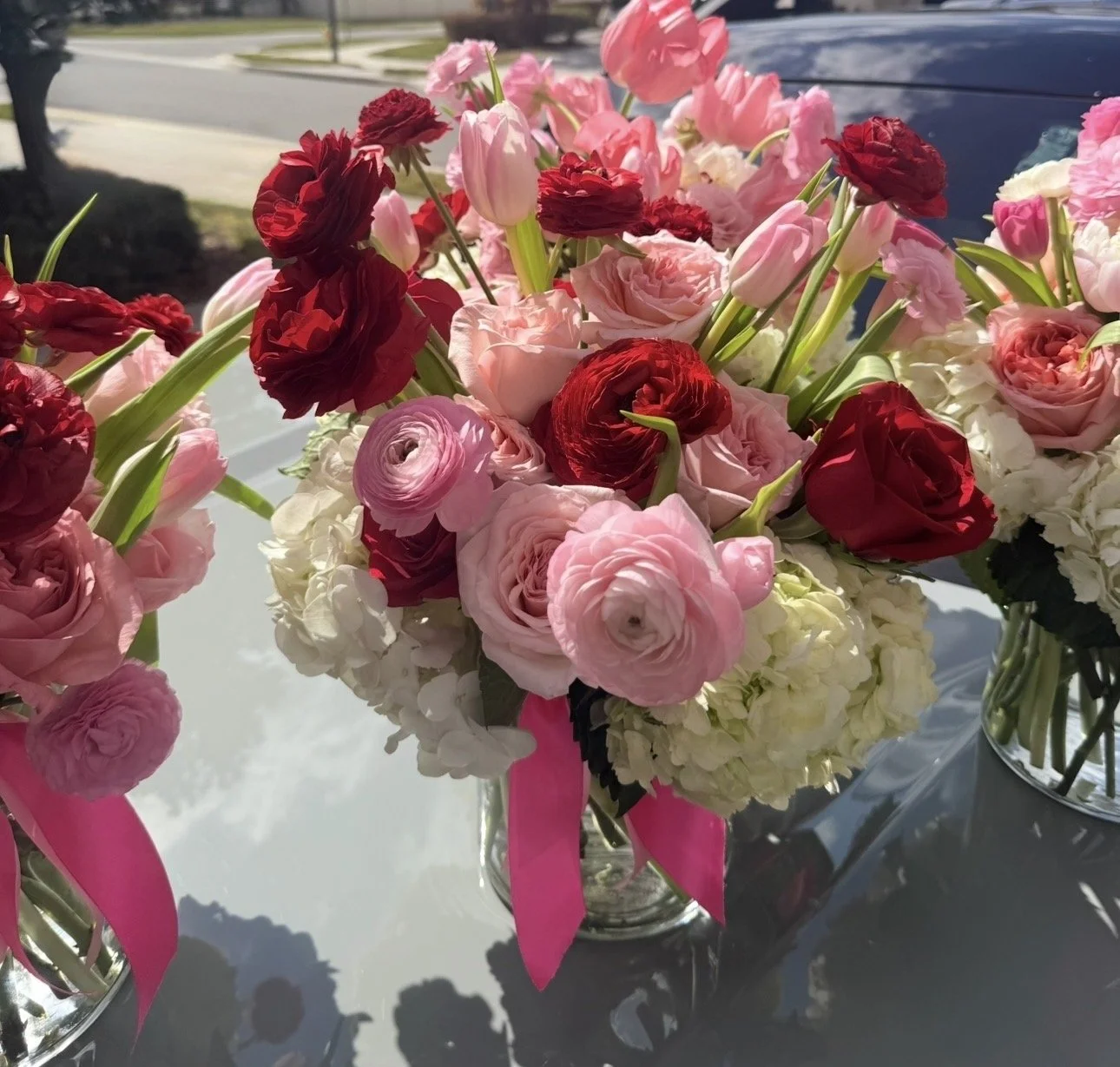 What makes this arrangement stand out is its intentional color blocking. Instead of blending tones together, the reds and pinks were allowed to breathe — creating dimension and visual movement from every angle.