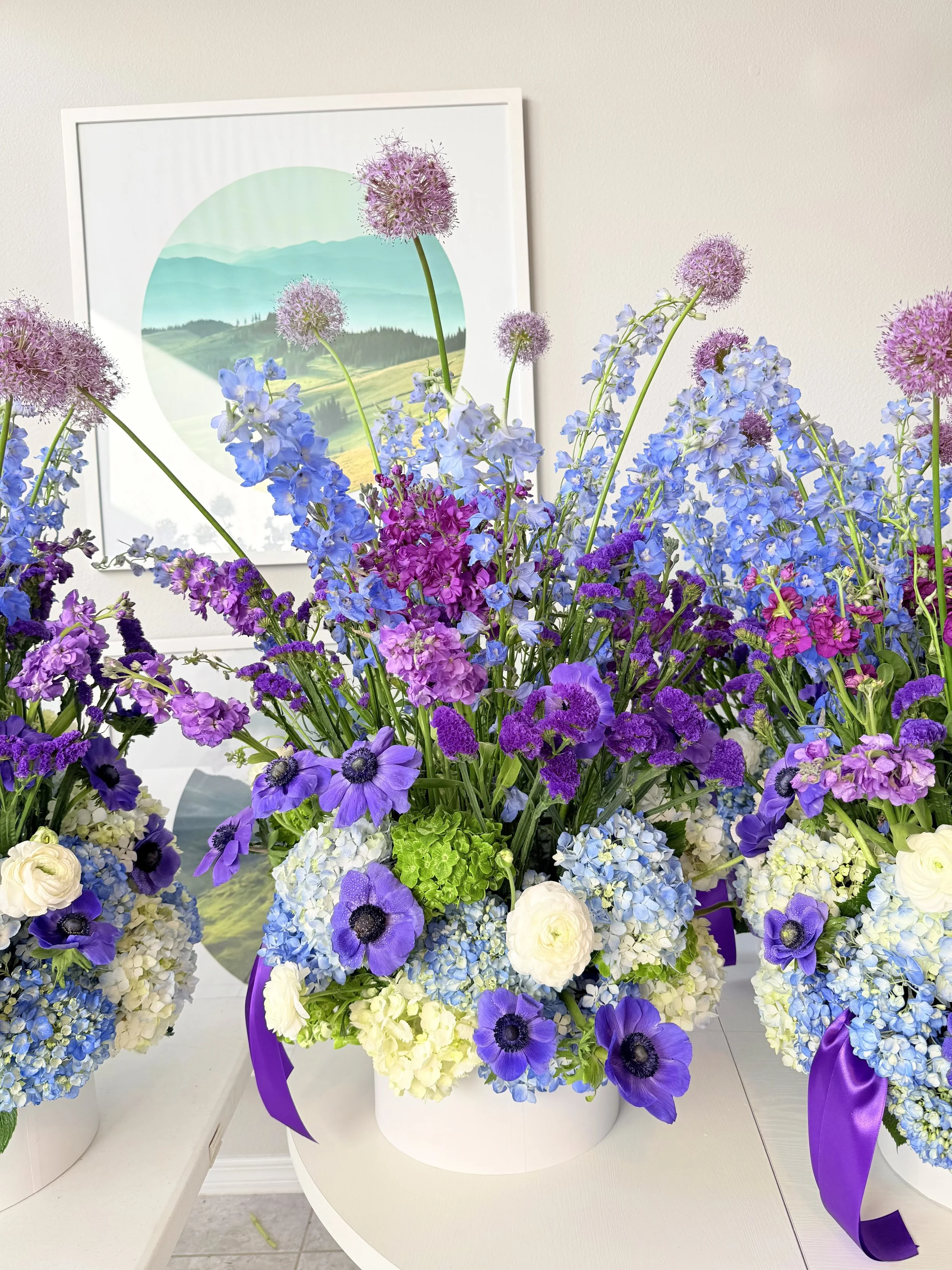 This arrangement was designed for a corporate event and centered around layered purples, lake blues, and crisp whites. The goal was to create something visually impactful from a distance while still feeling refined up close.